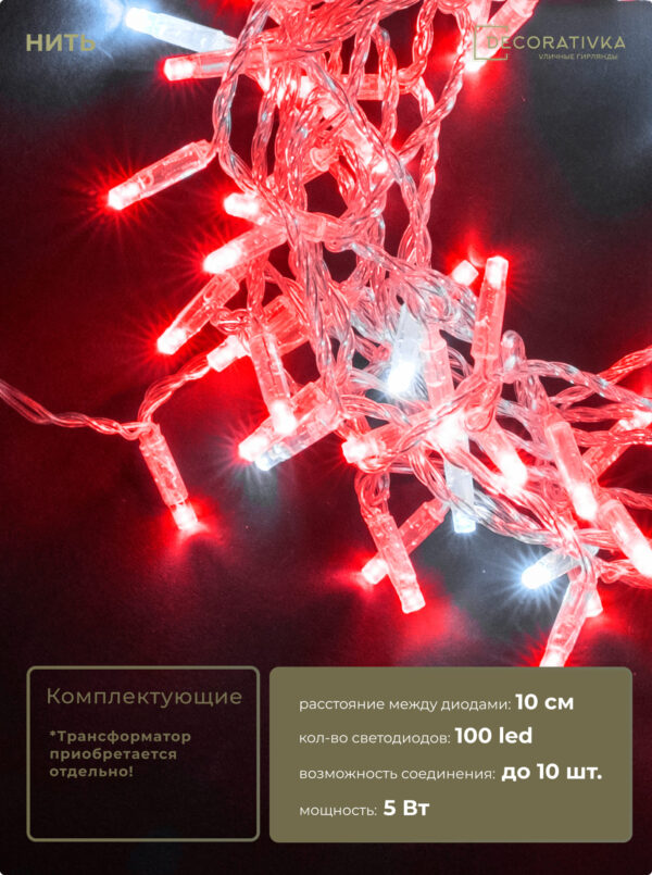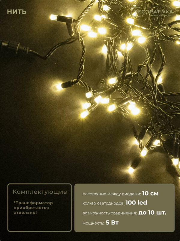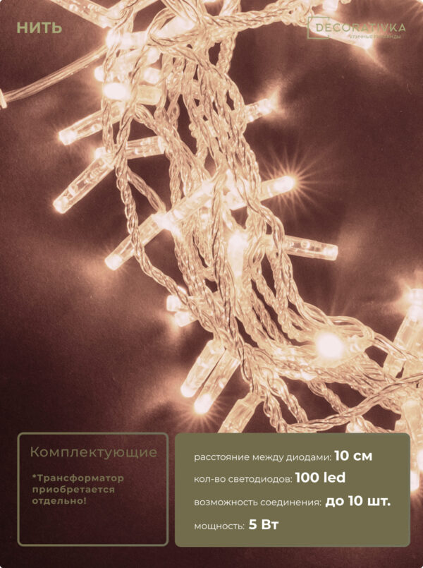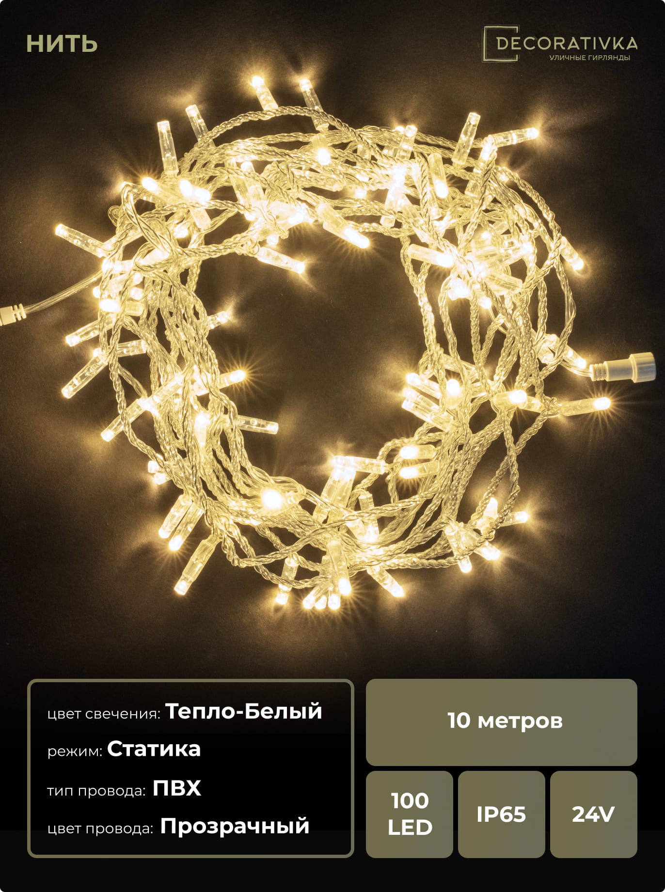 Гирлянда Нить с Колпачком 10м Тепло-Белая 24В, 100 LED, Провод Прозрачный ПВХ, IP65