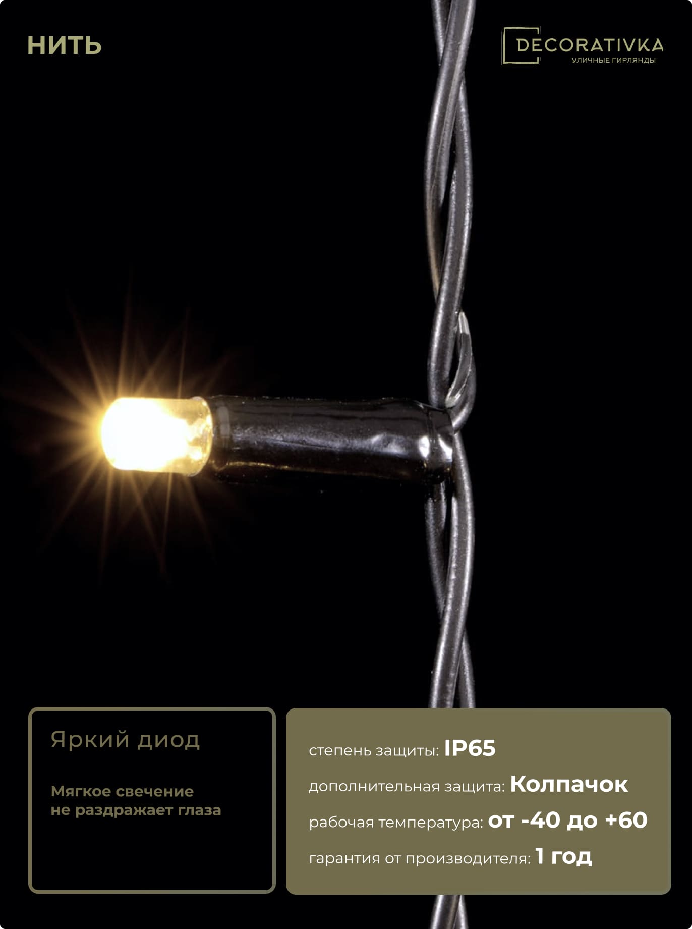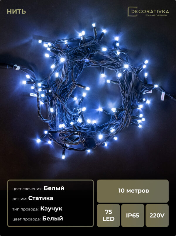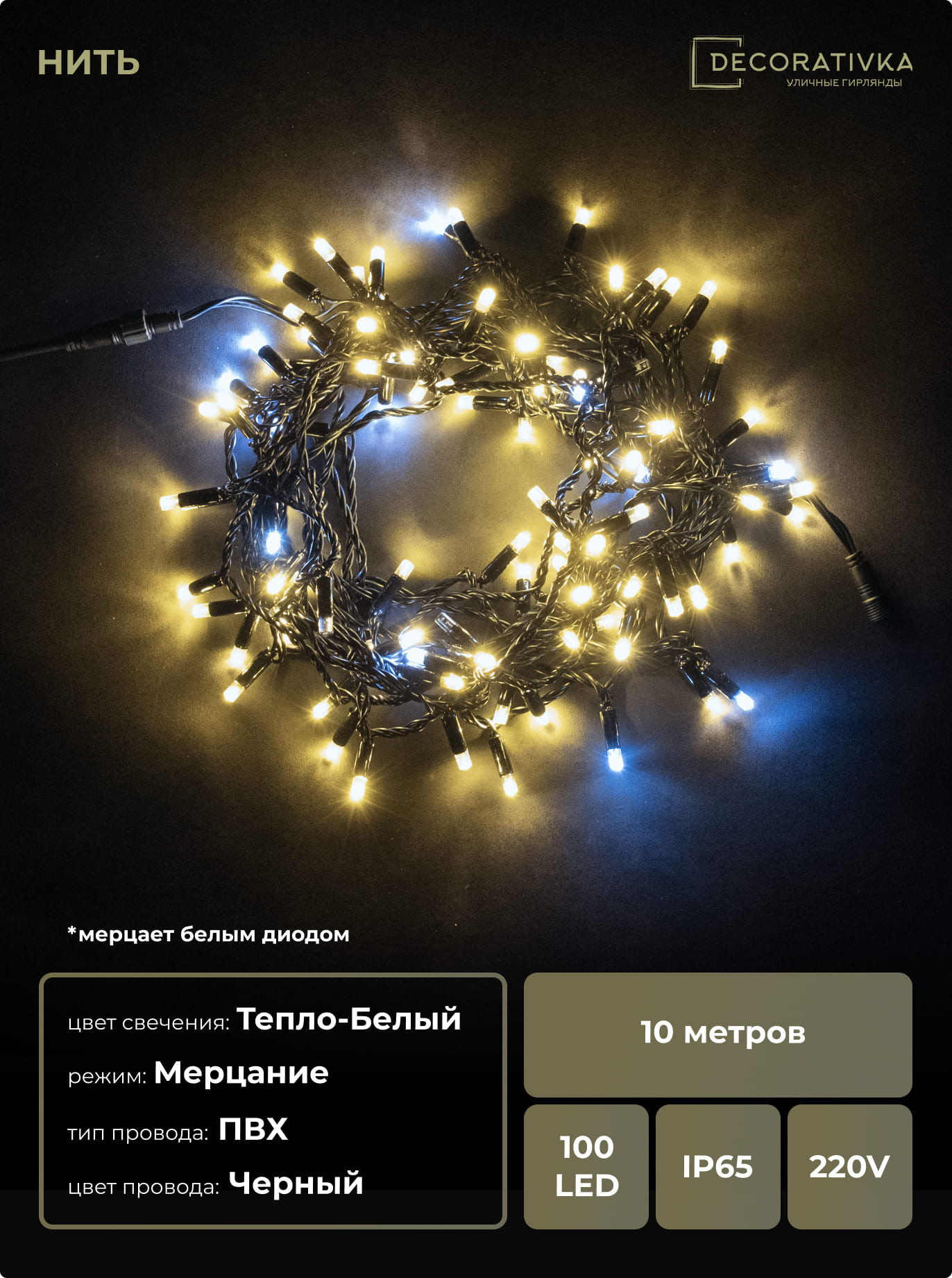 Гирлянда Нить с Колпачком 10м Тепло-Белая с Мерцанием Белого Диода 220В, 100 LED, Провод Черный ПВХ, IP65