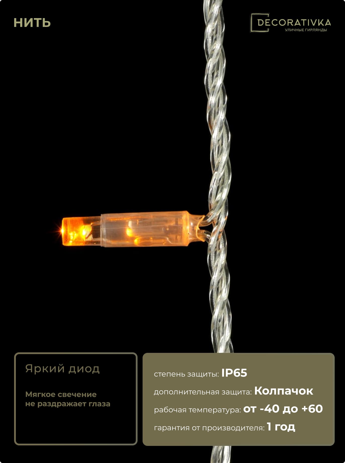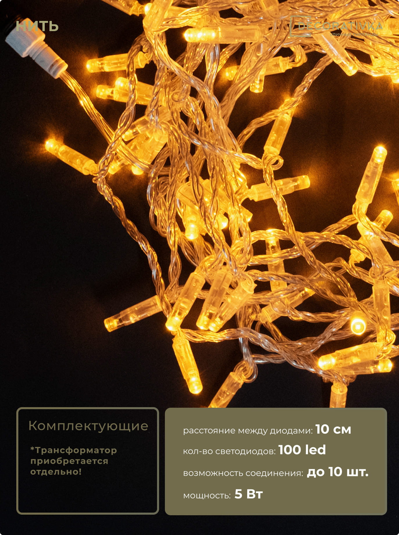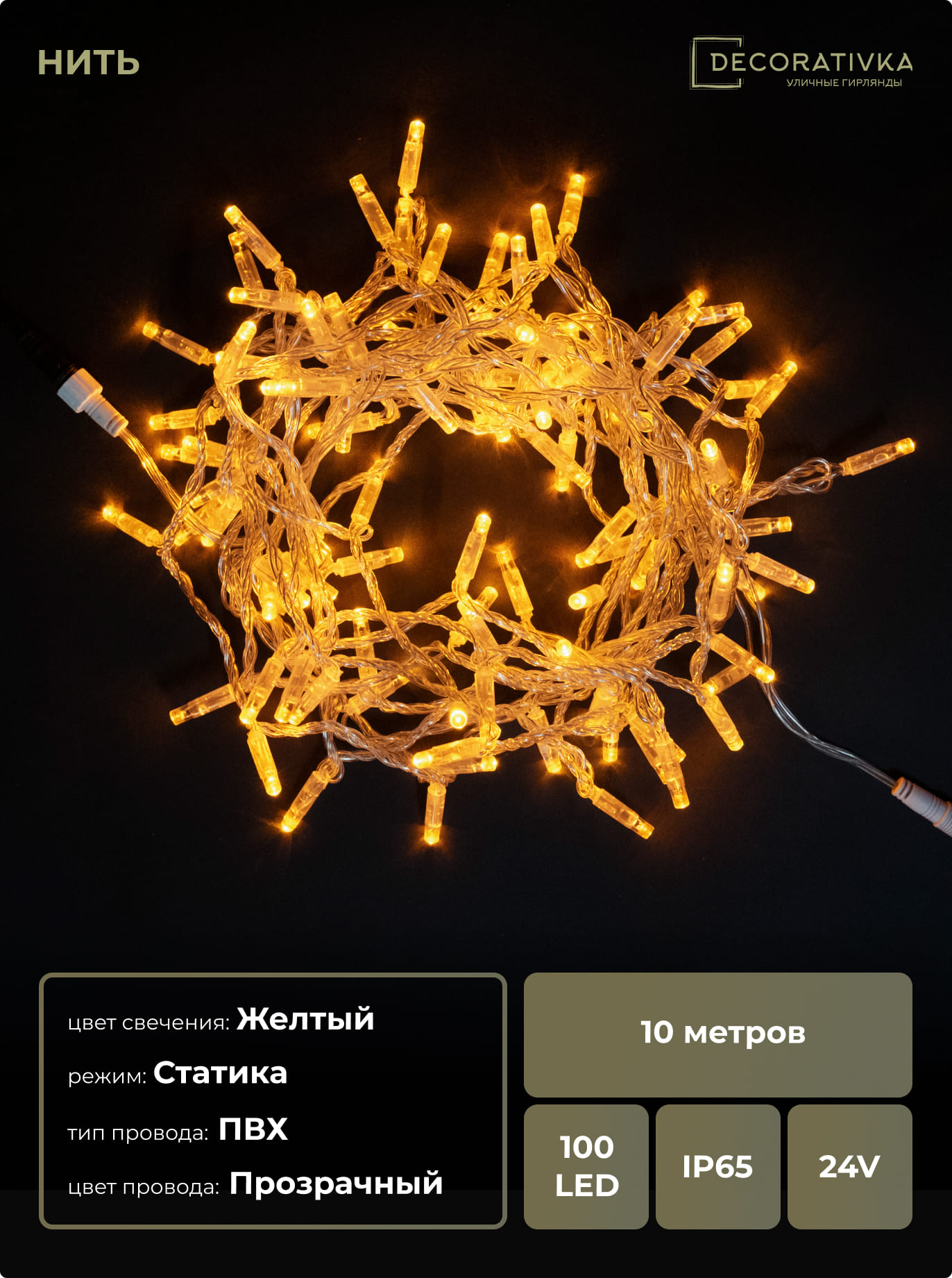 Гирлянда Нить с Колпачком 10м Желтая 24В, 100 LED, Провод Прозрачный ПВХ, IP65