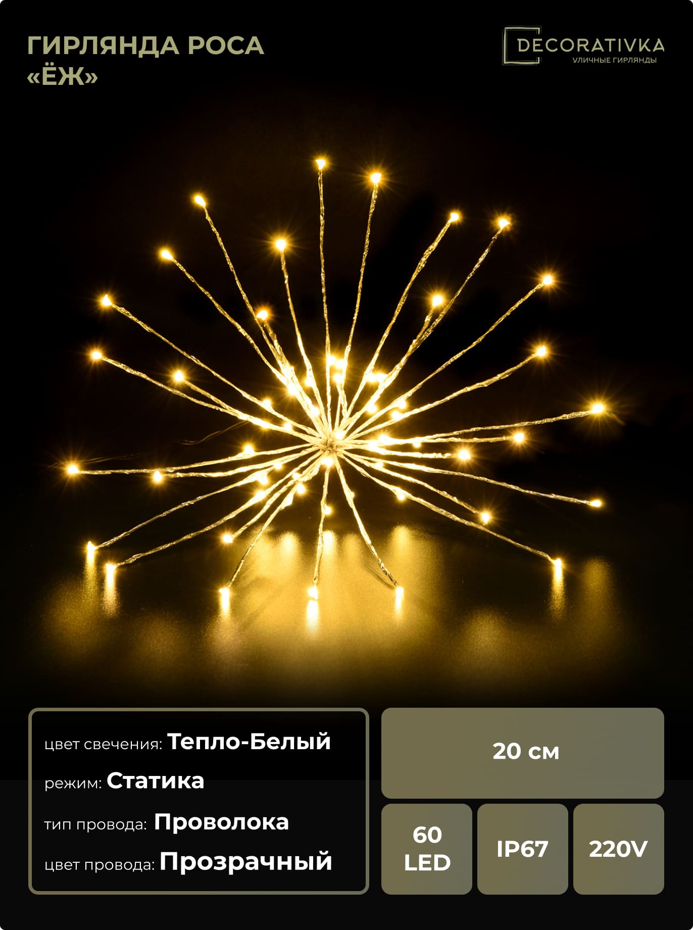 Гирлянда Роса «Еж» 20см Тепло-Белая, 60 LED, Провод Прозрачный Проволока, IP67