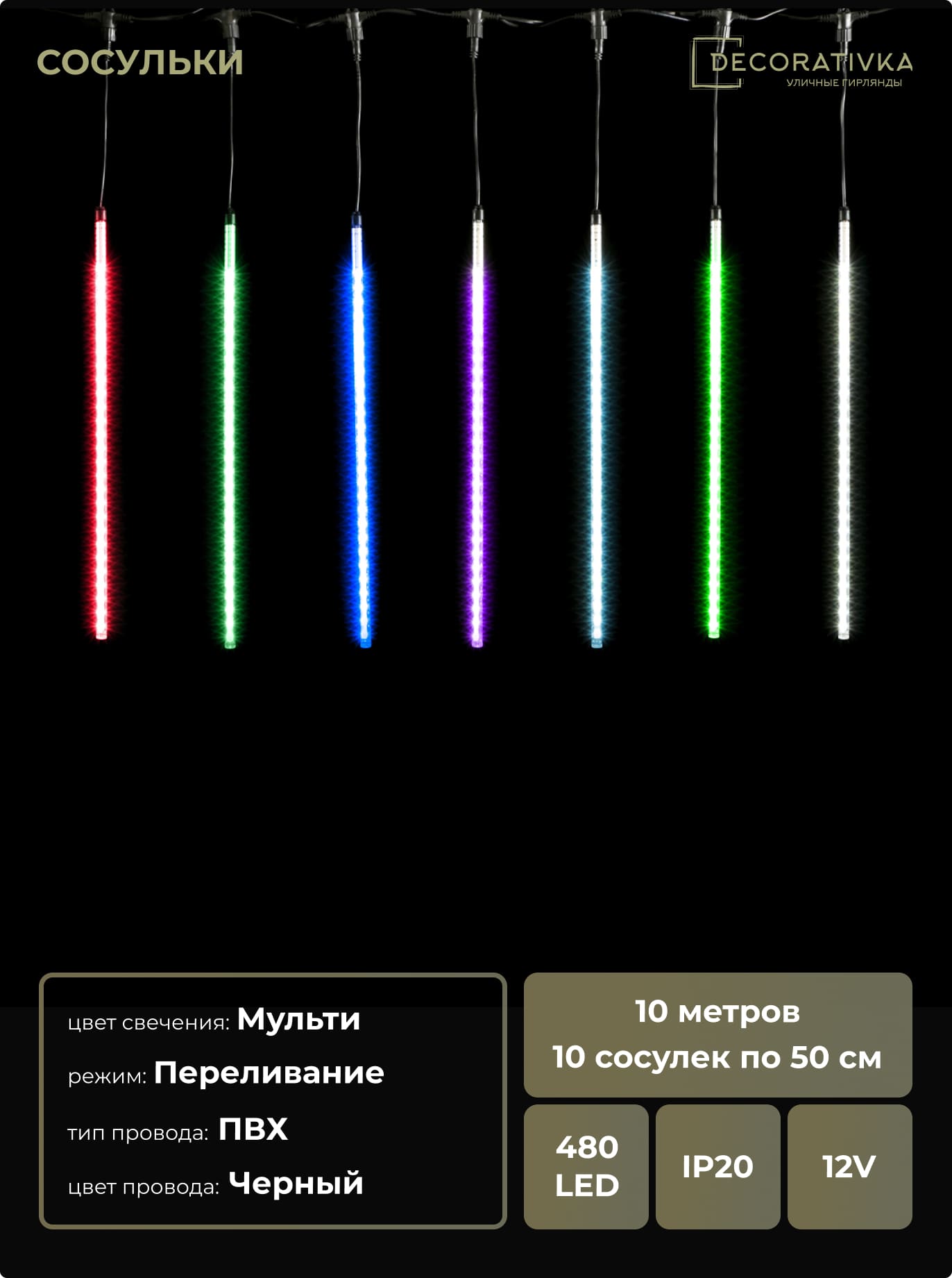 Гирлянда Тающие Сосульки 10шт по 50см, 12В, 480 Разноцветных Светодиодов, Провод Черный ПВХ, IP20