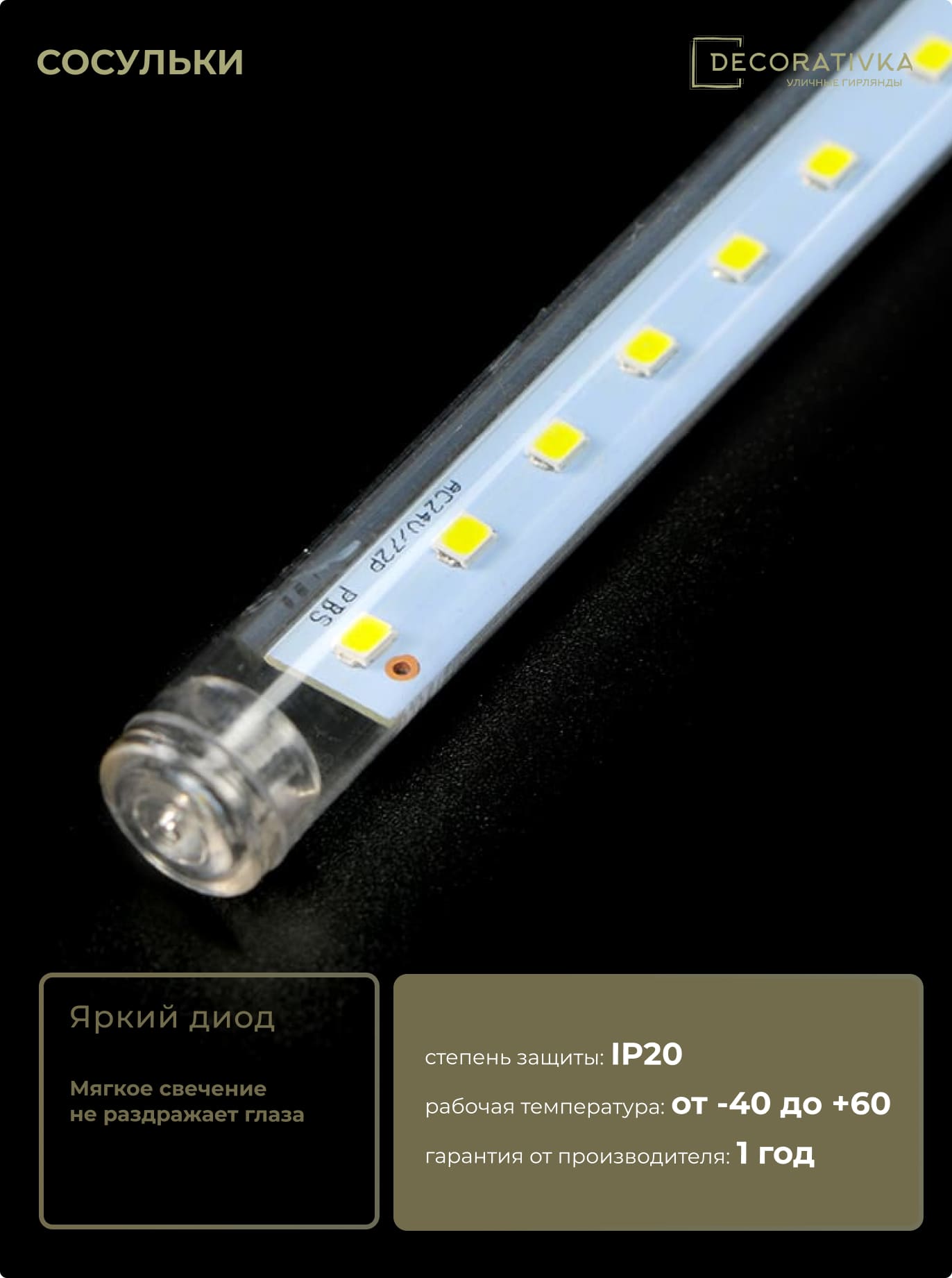 Гирлянда Тающие Сосульки 5шт по 30см, 12В, 150 Белых Светодиодов, Провод Черный ПВХ, IP20