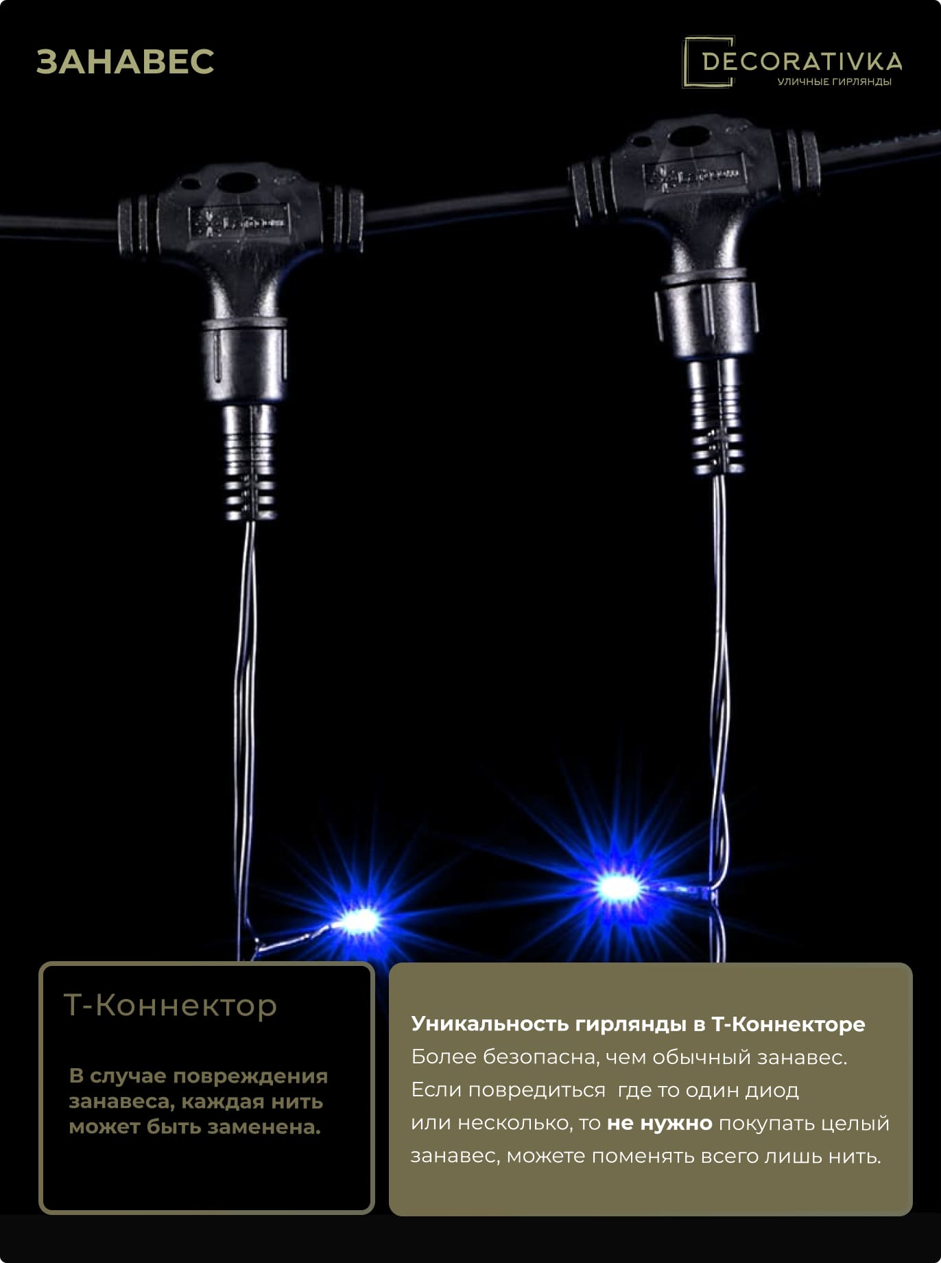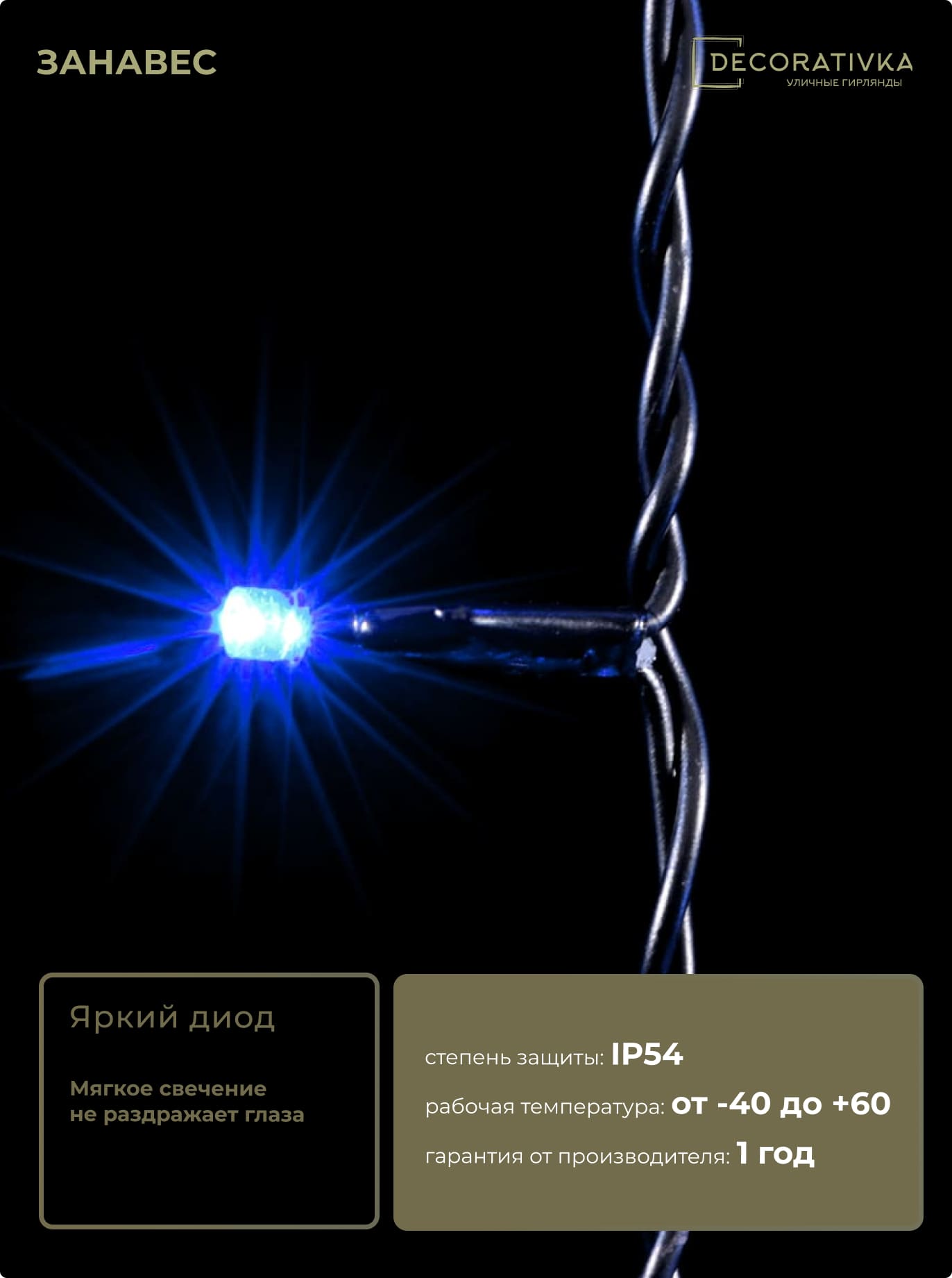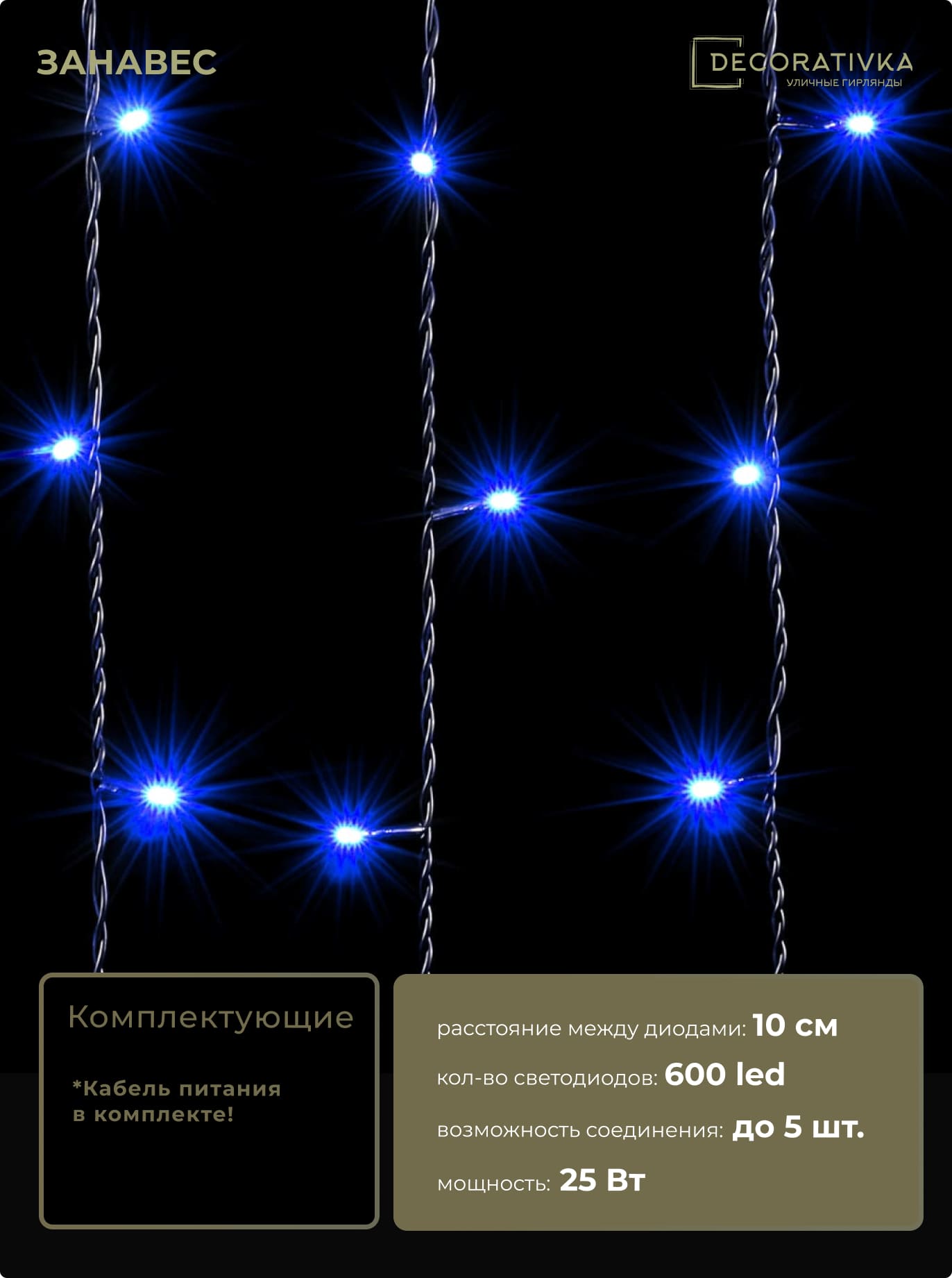 Гирлянда Занавес 1 x 6 м Синий 220В, 600 LED, Провод Черный ПВХ, IP54