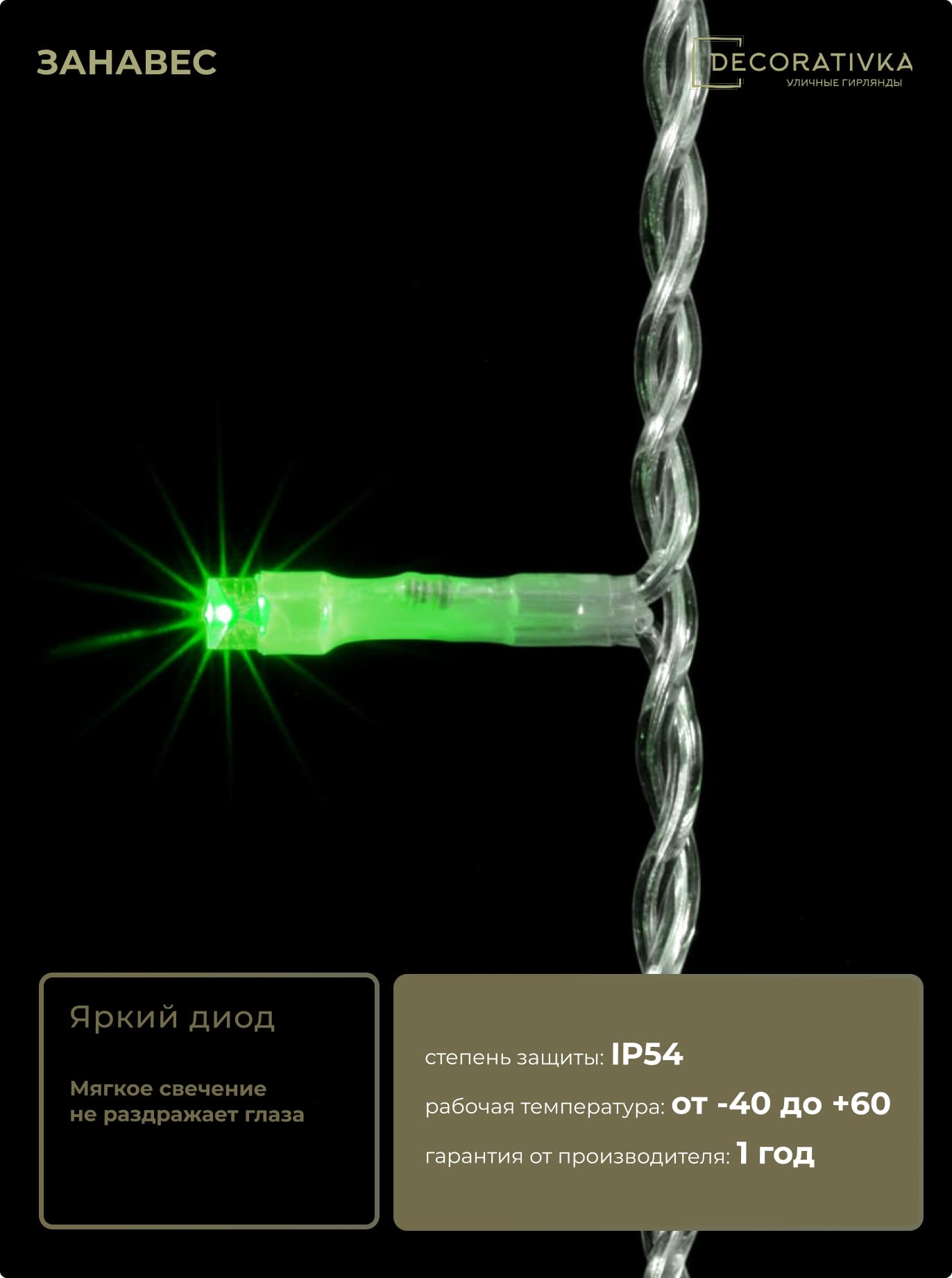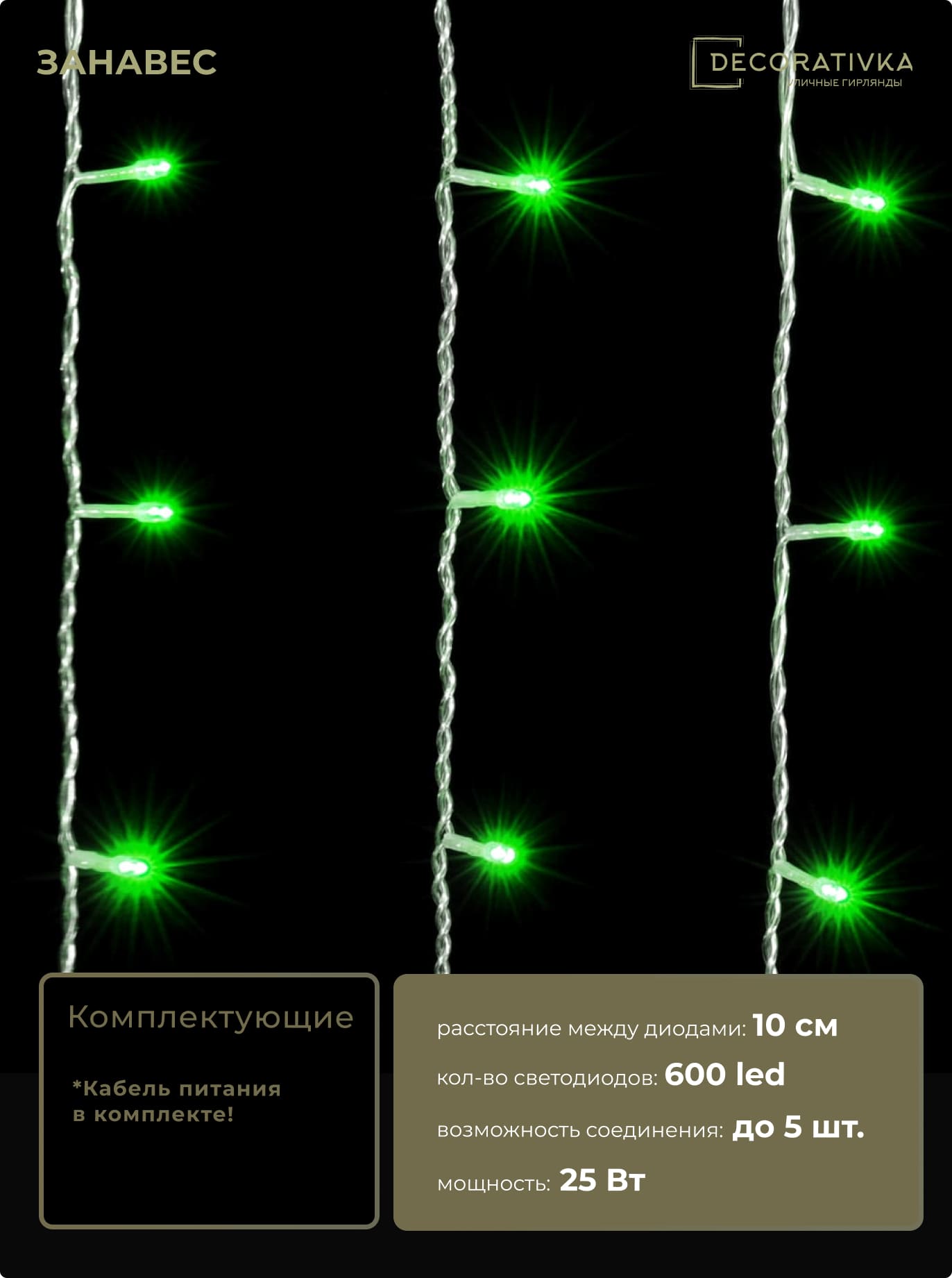 Гирлянда Занавес 1 x 6 м Зеленый 220В, 600 LED, Провод Прозрачный ПВХ, IP54