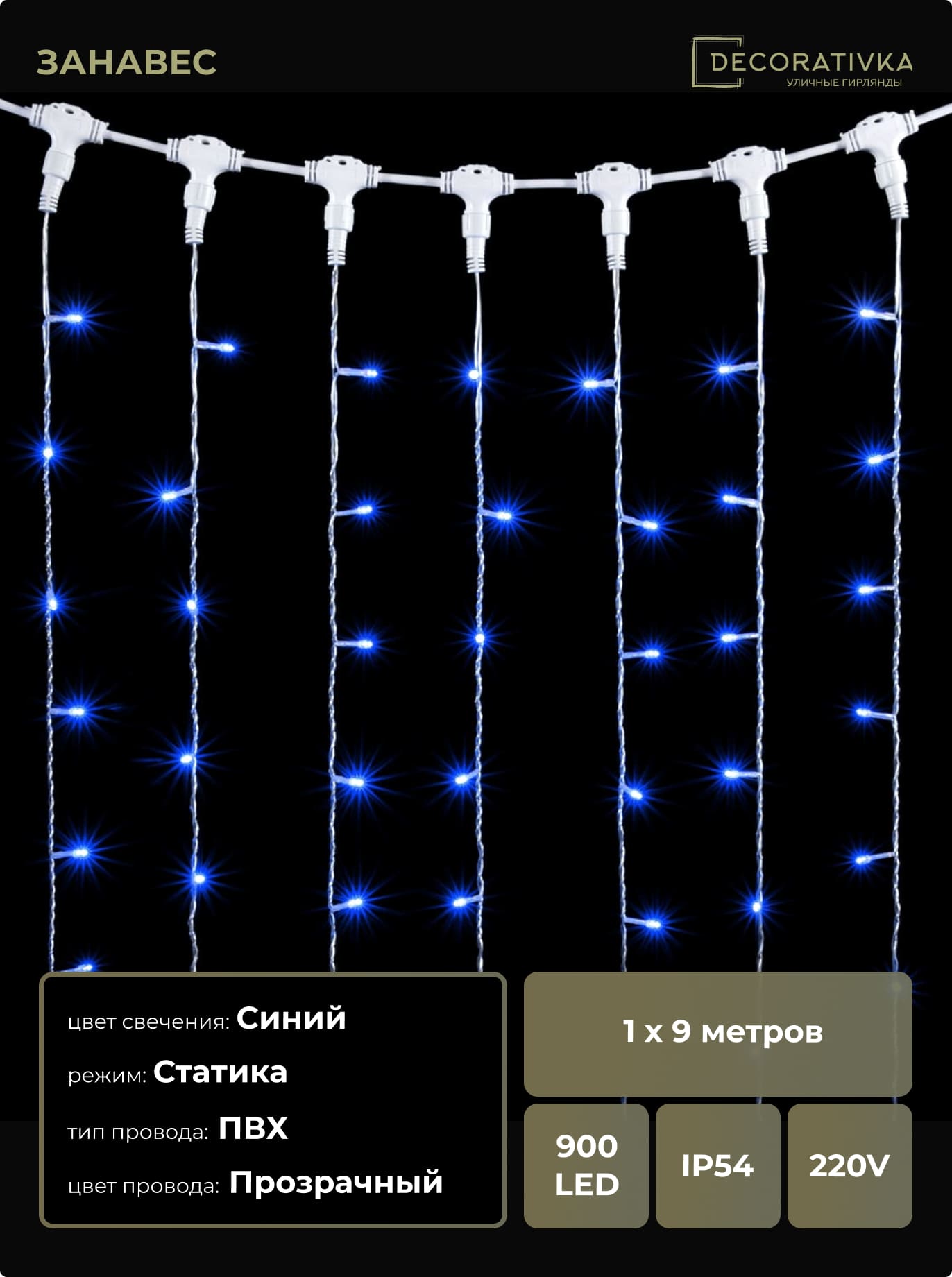 Гирлянда Занавес 1 x 9 м Синий 220В, 900 LED, Провод Прозрачный ПВХ, IP54