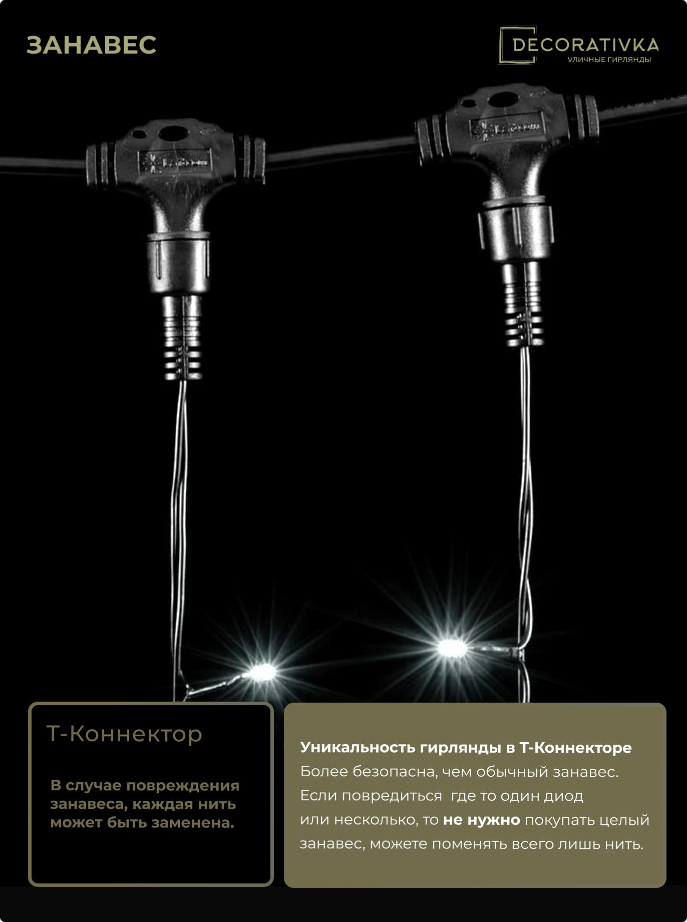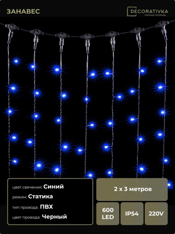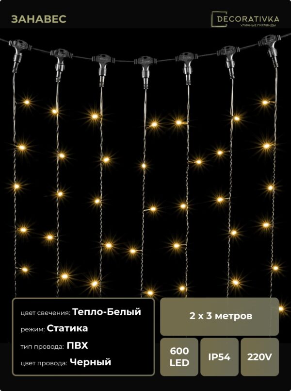 Гирлянда Занавес 2 x 3 м Белый 220В, 600 LED, Провод Черный ПВХ, IP54