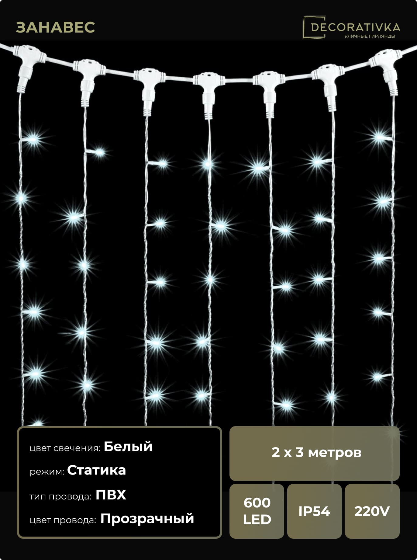 Гирлянда Занавес 2 x 3 м Белый 220В, 600 LED, Провод Прозрачный ПВХ, IP54