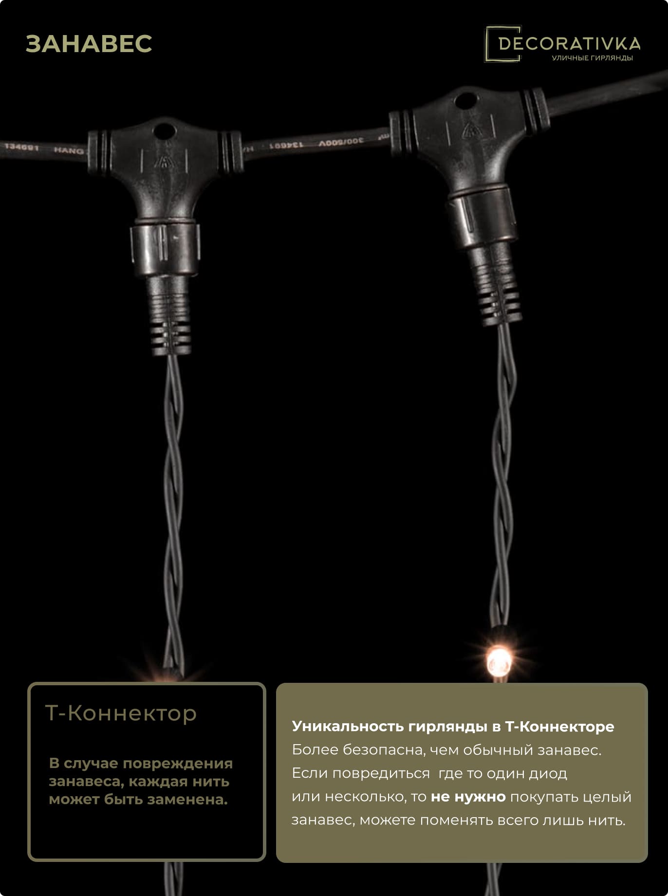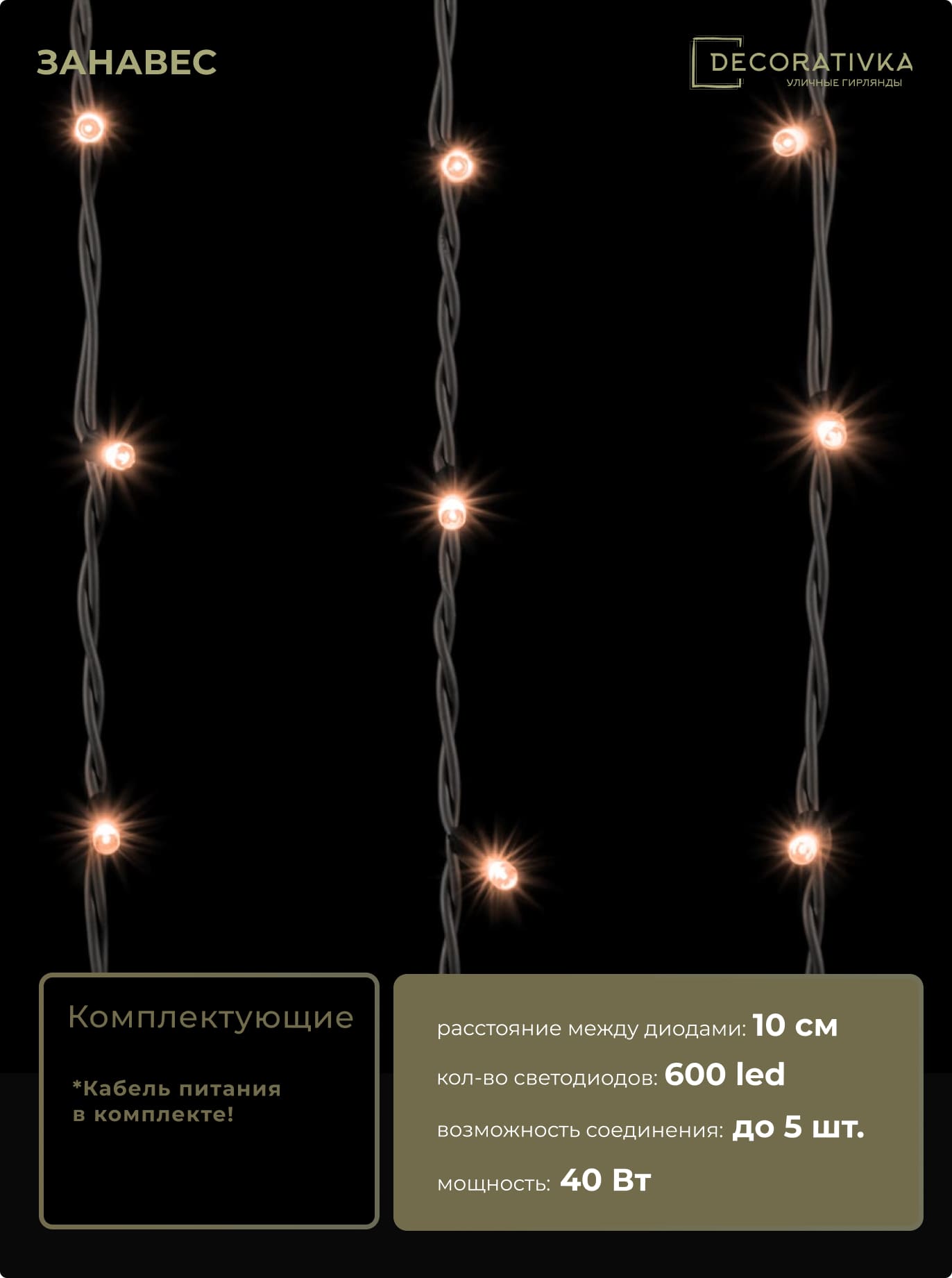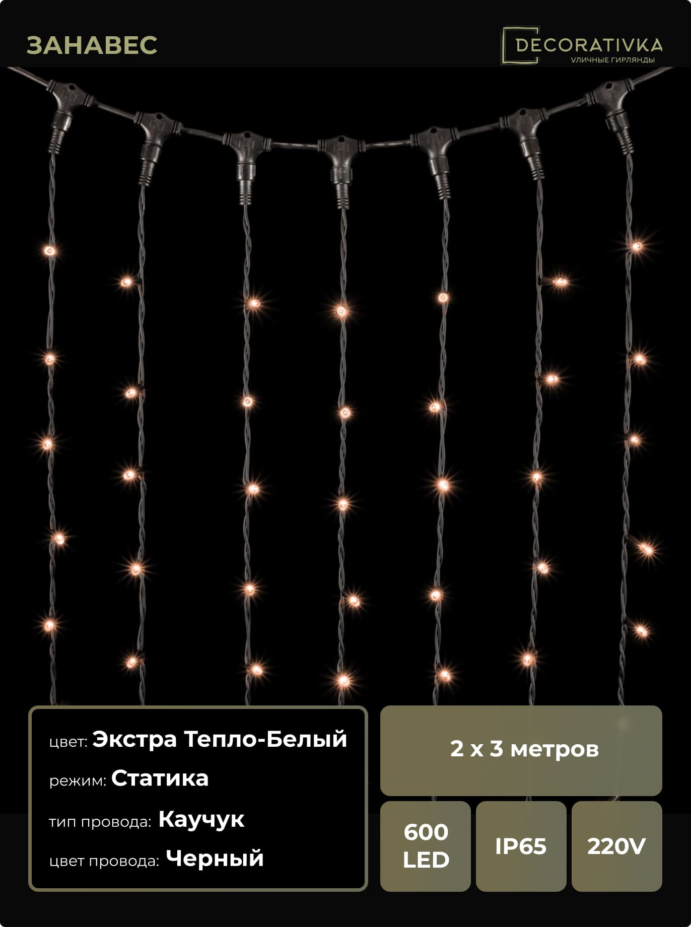 Гирлянда Занавес 2 x 3 м Экстра Тепло-Белый 220В, 600 LED, Провод Черный Каучук, IP65