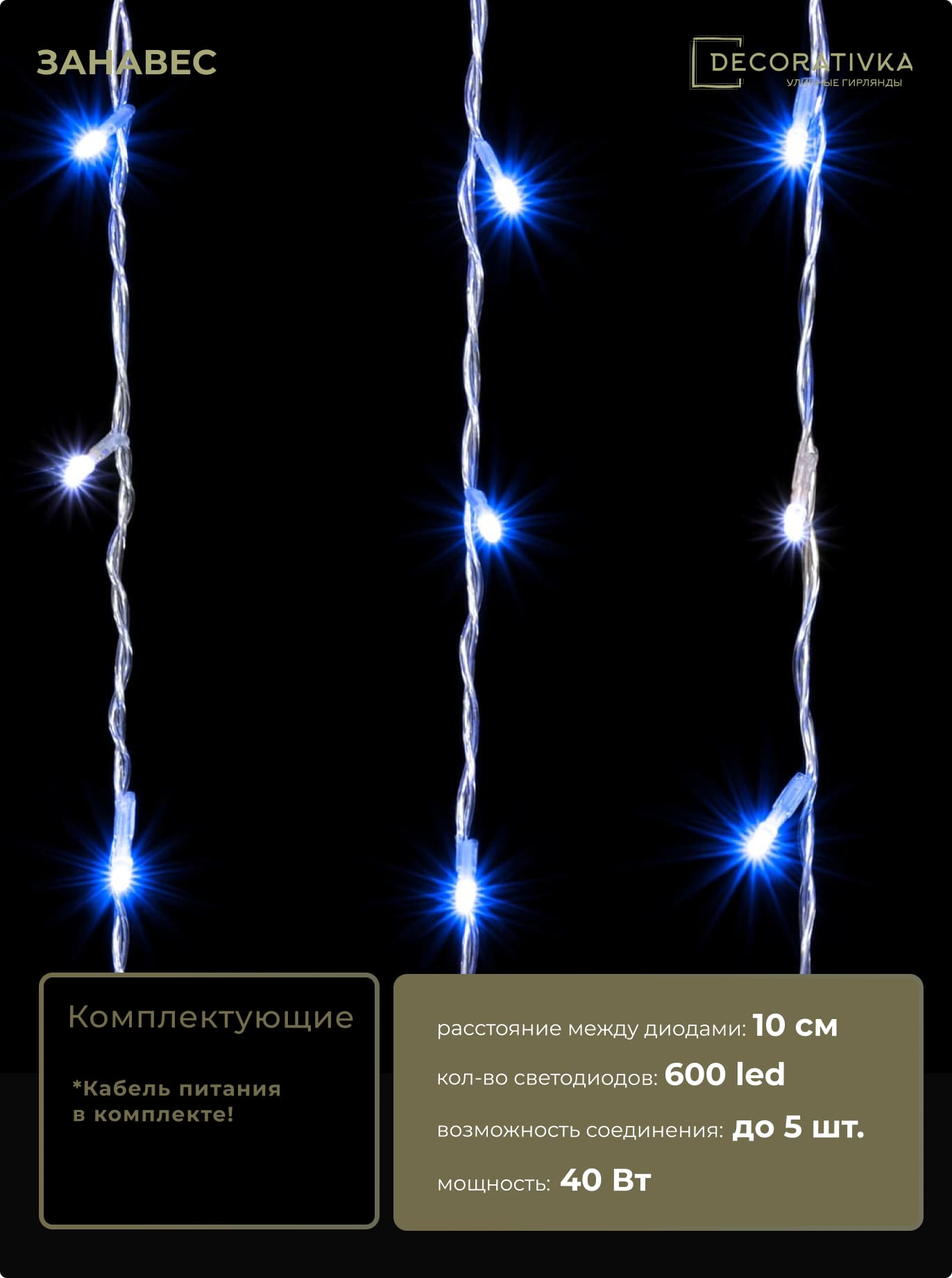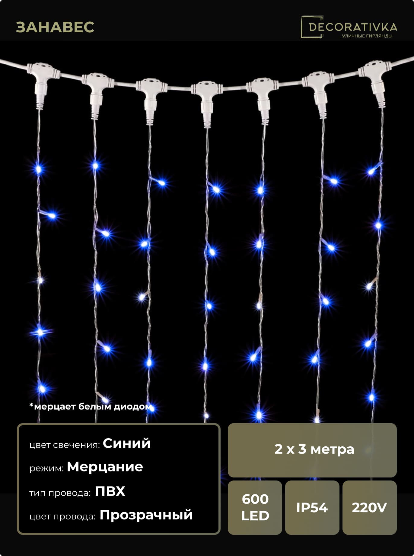 Гирлянда Занавес 2 x 3 м Синий с Мерцанием Белого Диода 220В, 600 LED, Провод Прозрачный ПВХ, IP54