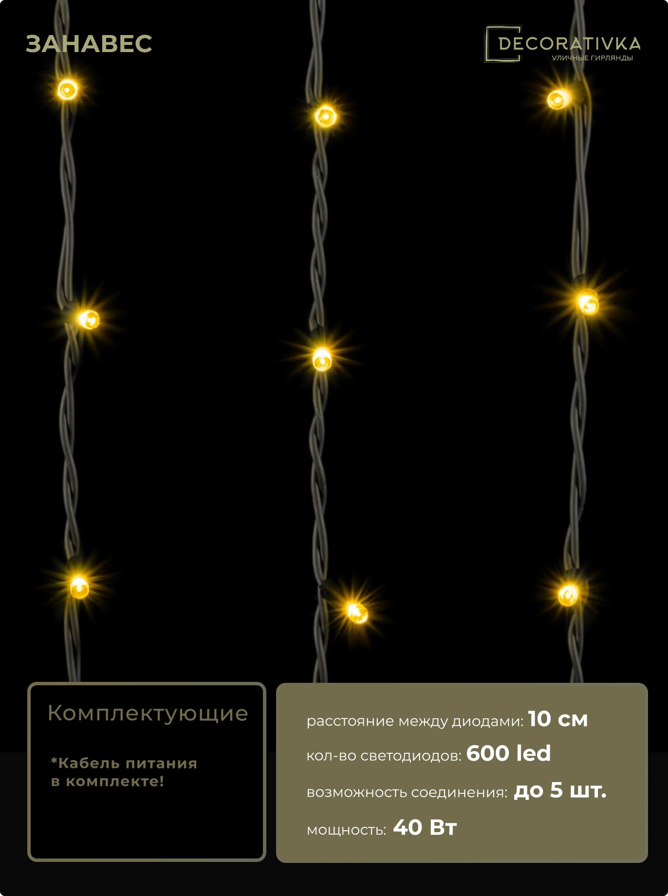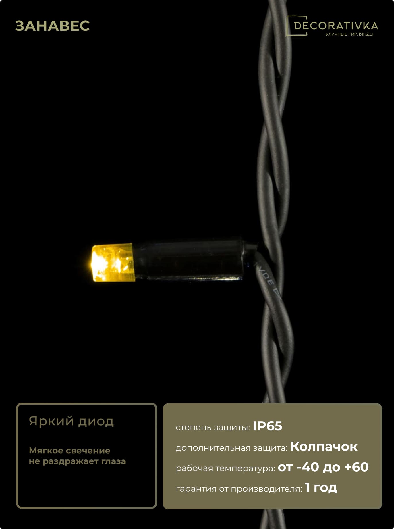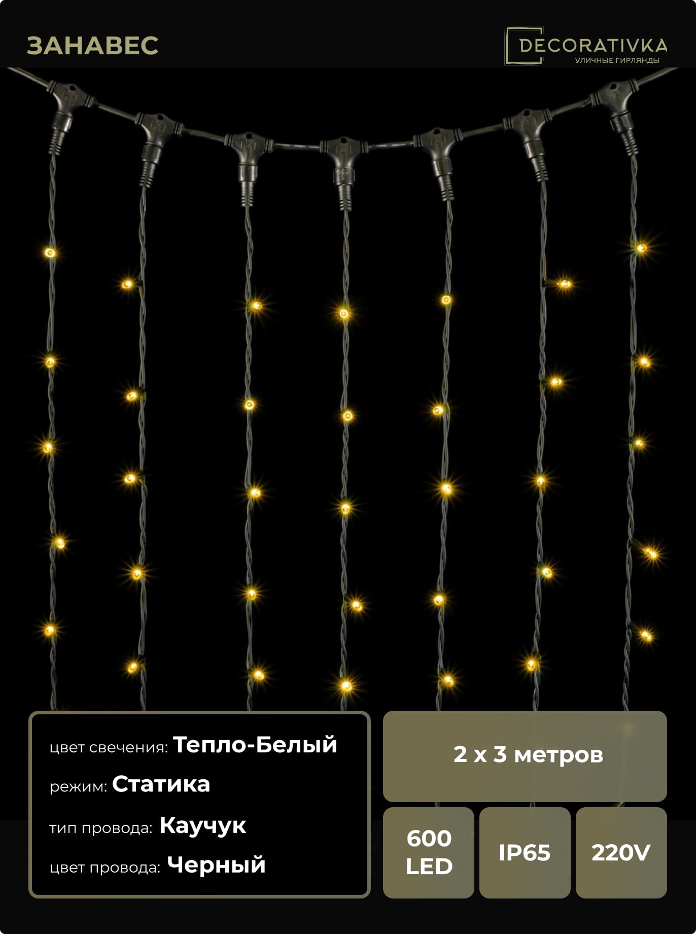 Гирлянда Занавес 2 x 3 м Тепло-Белый 220В, 600 LED, Провод Черный Каучук, IP65