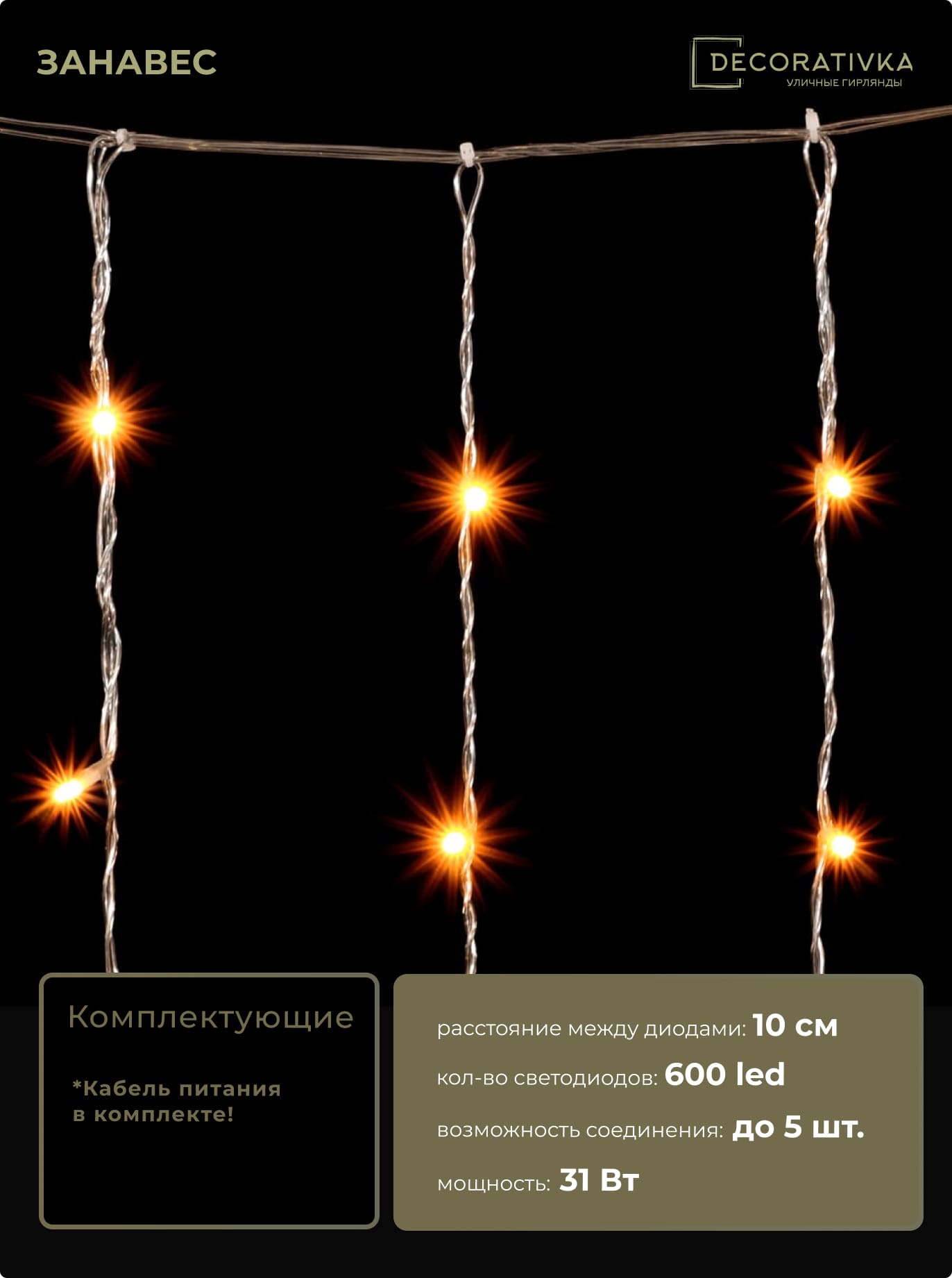 Гирлянда Занавес Облегченный 2 x 3 м Желтый 220В, 600 LED, Провод Прозрачный ПВХ, IP54