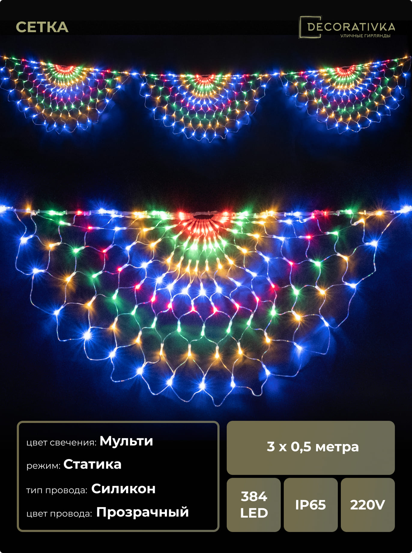 Светодиодная Сеть Радужная 3 x 0,5 м Разноцветная, 384 LED, Провод Прозрачный Силикон, IP65